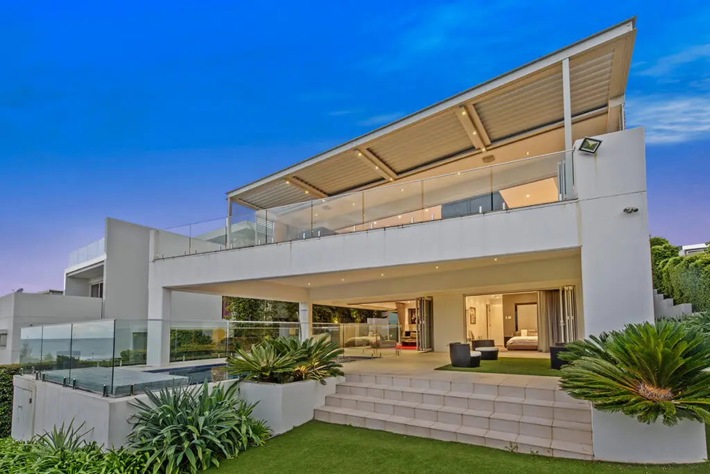 Bright, modern home by the sea with clean architecture and twilight lighting.